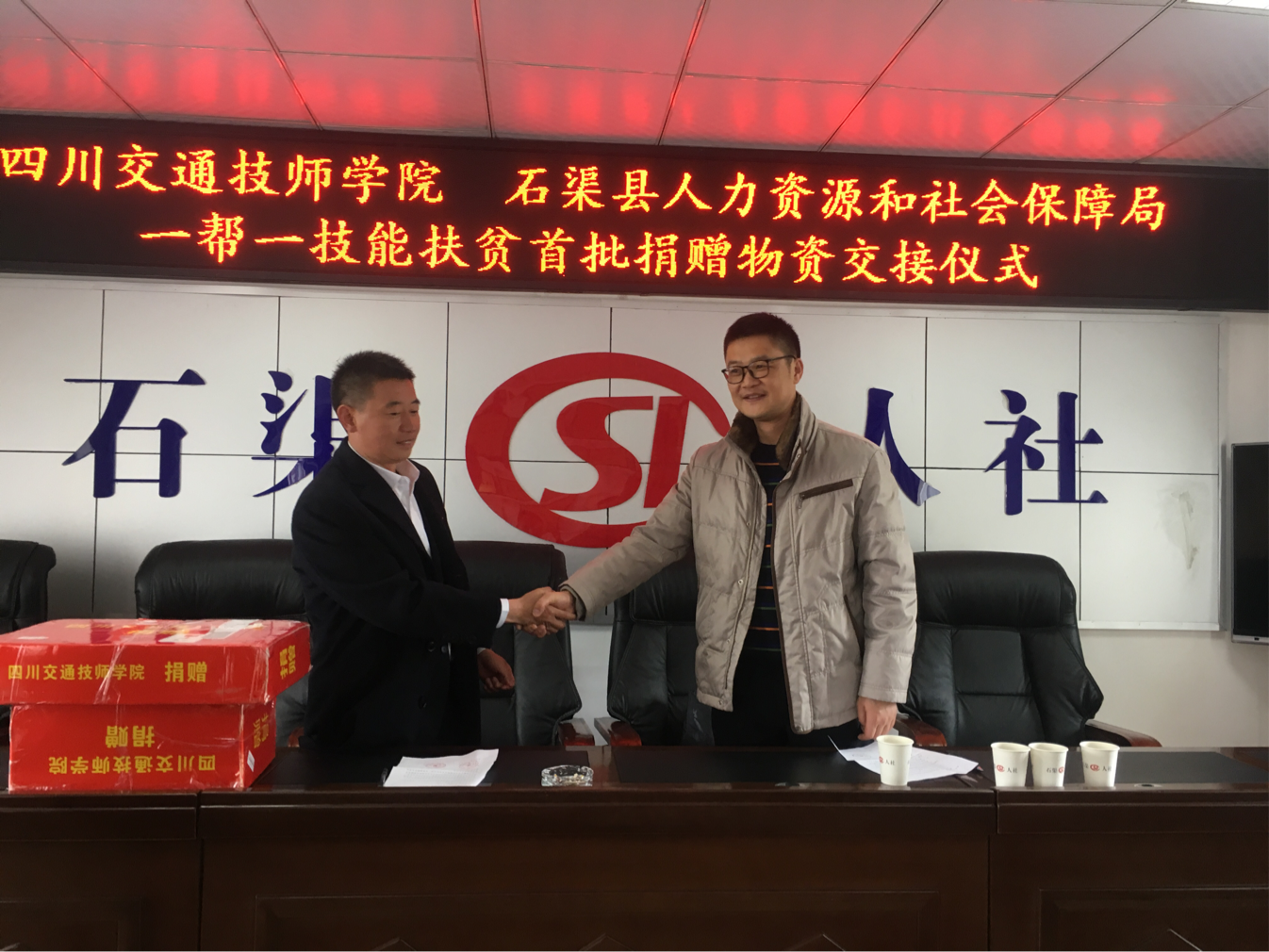 招聘会结束后,学院向石渠县人社局捐赠了首批用于共建摩托车维修培训基地的物资。双方约定,摩托车维修培训基地选址确定后,学院安排专业教师负责维修培训基地的环境设计,同时捐赠第二批物资。