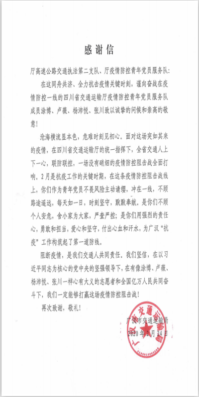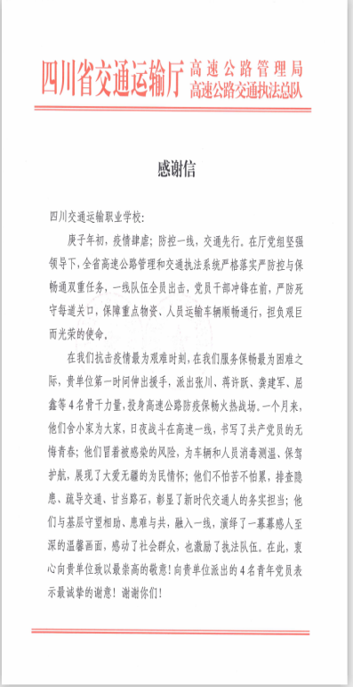 自新冠肺炎疫情暴发以来,举国上下团结一致,抗击新冠病毒。除了直面病毒的医务工作者,其他各行各业也以防疫抗疫为中心紧锣密鼓地开展工作,交通运输行业也始终活跃在防控一线。我校四名青年党员教师蒋许跃、屈鑫、龚建军、张川积极响应四川省交通运输厅号召,自愿报名加入“四川交通运输厅疫情防控青年党员服务队”,奔赴高速公路疫情防控一线,以“逆行者”的姿态义无反顾投身阻击战。