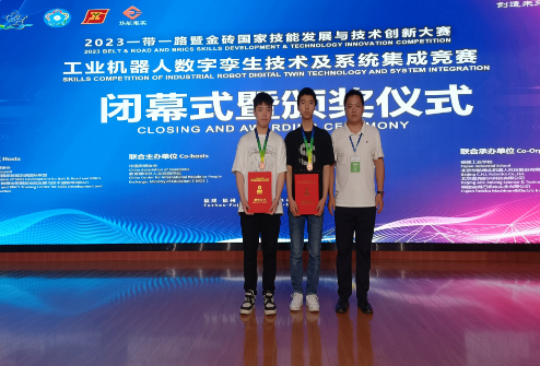 2023一带一路暨金砖国家技能发展与技术创新大赛—工业机器人数字孪生技术及系统集成竞赛(中职组中国区决赛)在福建工业学校成功举办。本次大赛共有来自全国中职院校的66支代表队参赛,历经2天激烈角逐,我校机电工程系曹虎、喻航两位同学组成的参赛队伍获得三等奖。