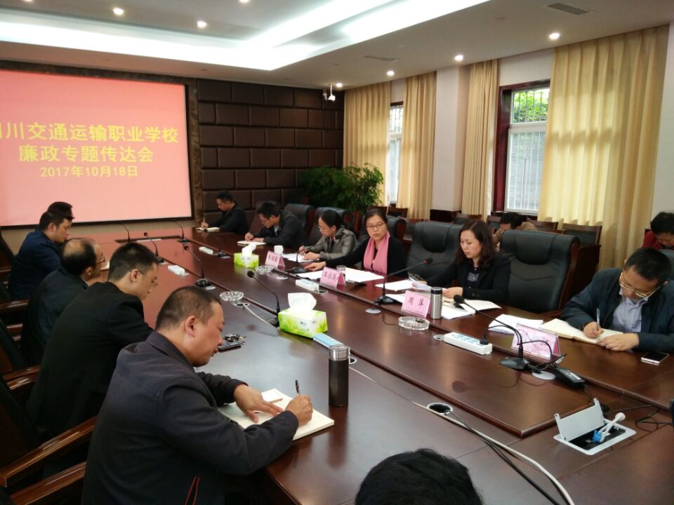 10月18日,交职校召开廉政专题传达会议,传达学习《中共四川省交通运输厅党组关于四川交通职业技术学院食堂招投标等问题的通报》、《周道平同志在交职学院食堂经营项目招投标等问题情况通报会上的讲话》和张琪副厅长、杜世相组长在对厅公路局党委集体约谈会上的讲话精神。校长王永莲要求:
